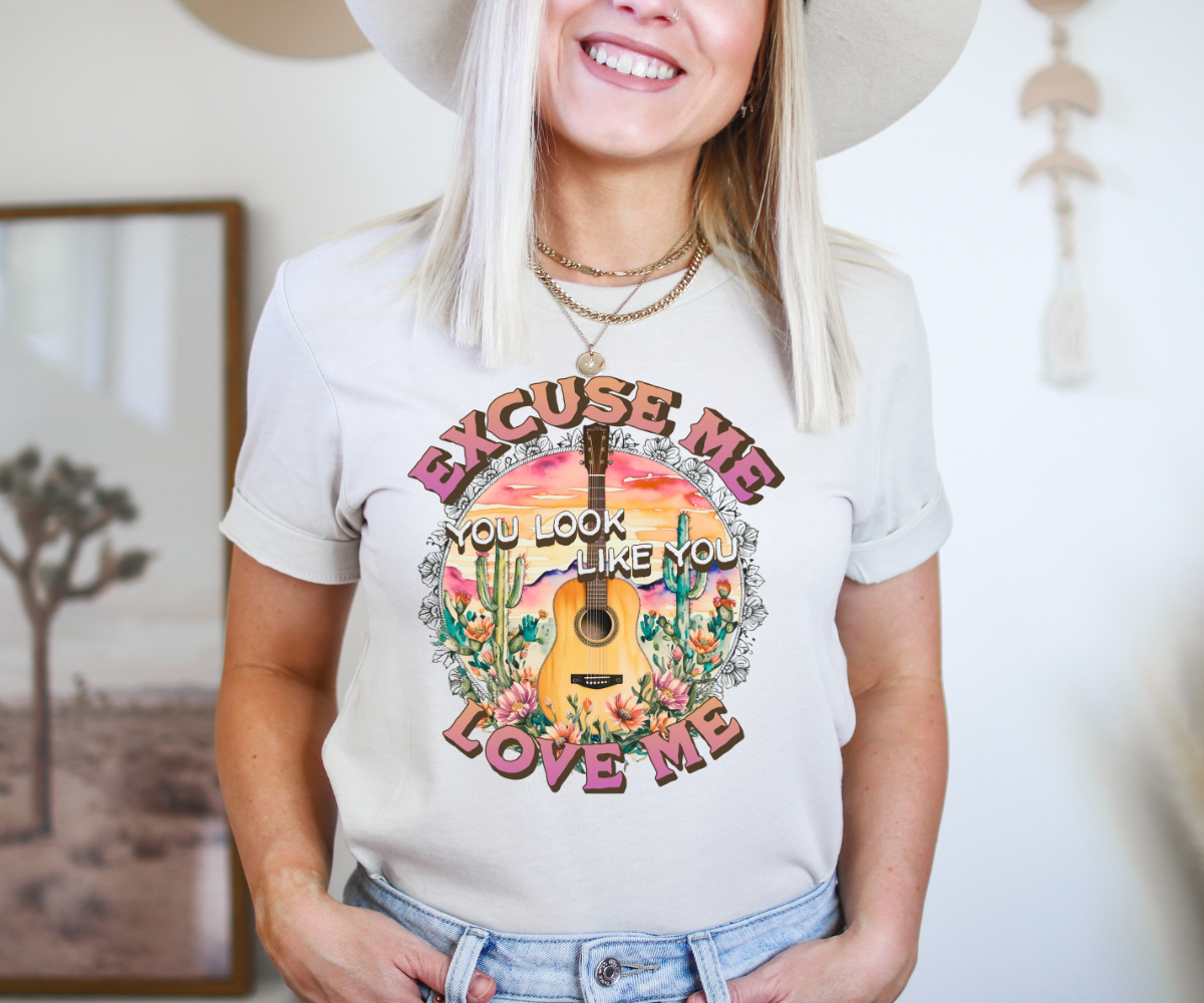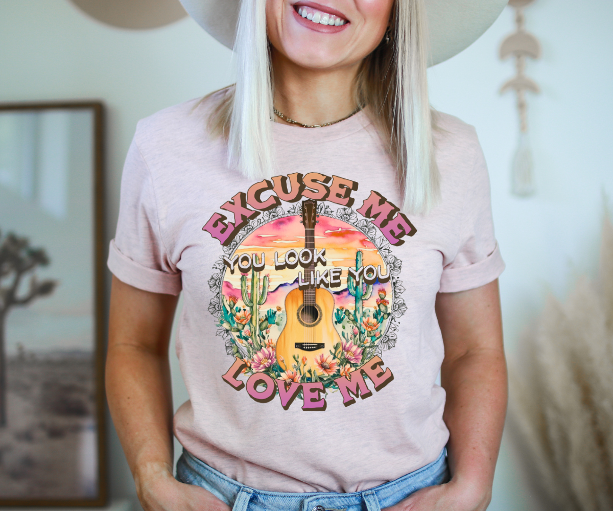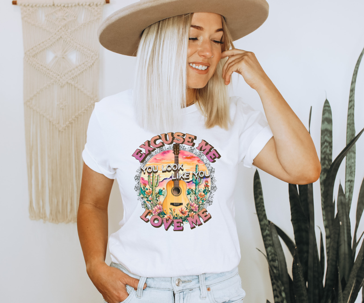 Add a dash of charm and a touch of sass to your wardrobe with this fun and flirty tee. The phrase "Excuse me, you look like you love me" is a perfect mix of confidence and humor, making it an ideal choice for any casual look.